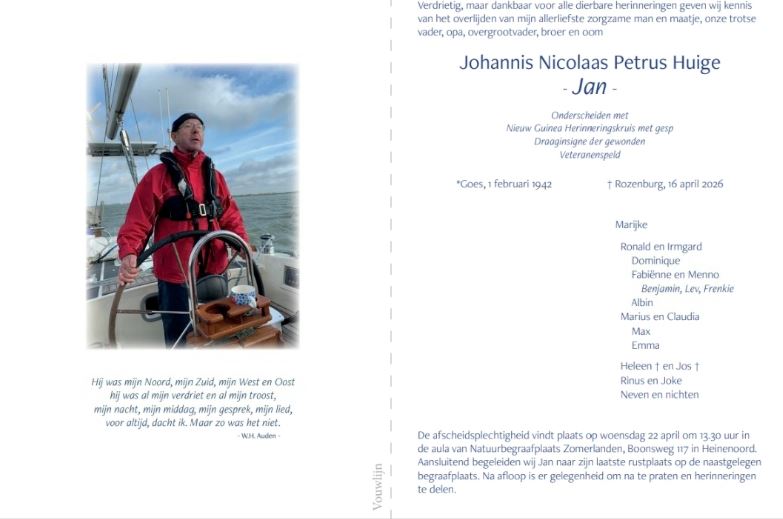 ” Op 16 April is de Rozenburgse Veteraan dhr Jan Huige op 84 jarige leeftijd overleden.